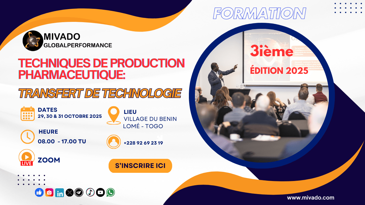 La formation continue est la clé pour maintenir l’excellence dans l’industrie pharmaceutique. C’est pourquoi Mivado GlobalPerformance, acteur de référence dans la formation spécialisée, vous invite à la 3ième édition de son atelier de formation sur un thème au cœur des défis de l’industrie pharmaceutique moderne : les techniques de production pharmaceutiques et le transfert de technologie.